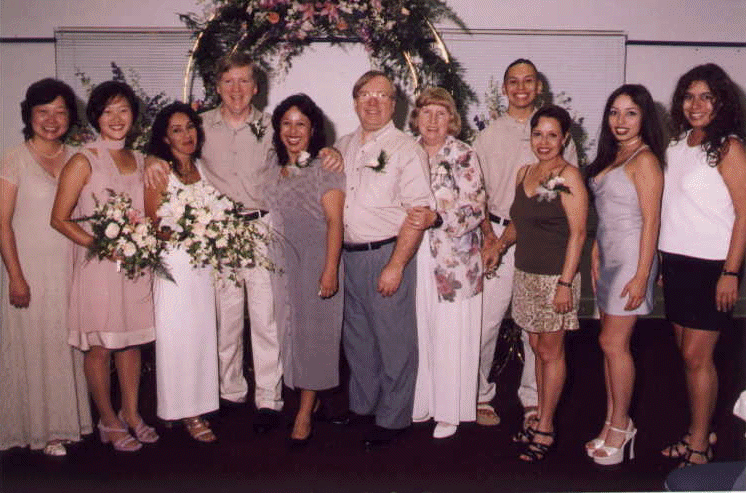 From left to right, Julie's mother Jenny, Julie, Guadalupe, Tim, Guadalupe's sister Marcela, Tim's brother John, Tim's mother Winnifred, Oscar, Guadalupe's sister Laura, Guadalupe's neice Laurita, and Guadalupe's neice Sandra. (Laurita and Sandra are Laura's children.)